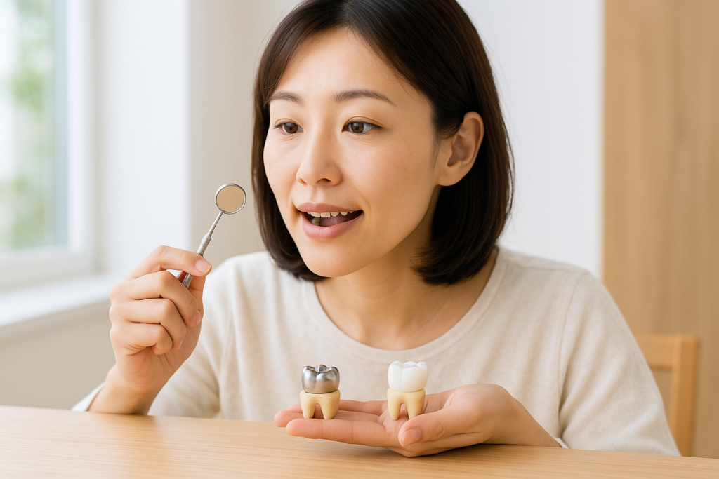 ※小さな銀の詰め物(インレー)の場合は、コンポジットレジンやセラミックインレーなど、もう少し選択肢が増えますが、ここでは「銀のかぶせ物(クラウン)を白くしたい場合」を中心にお話しします。